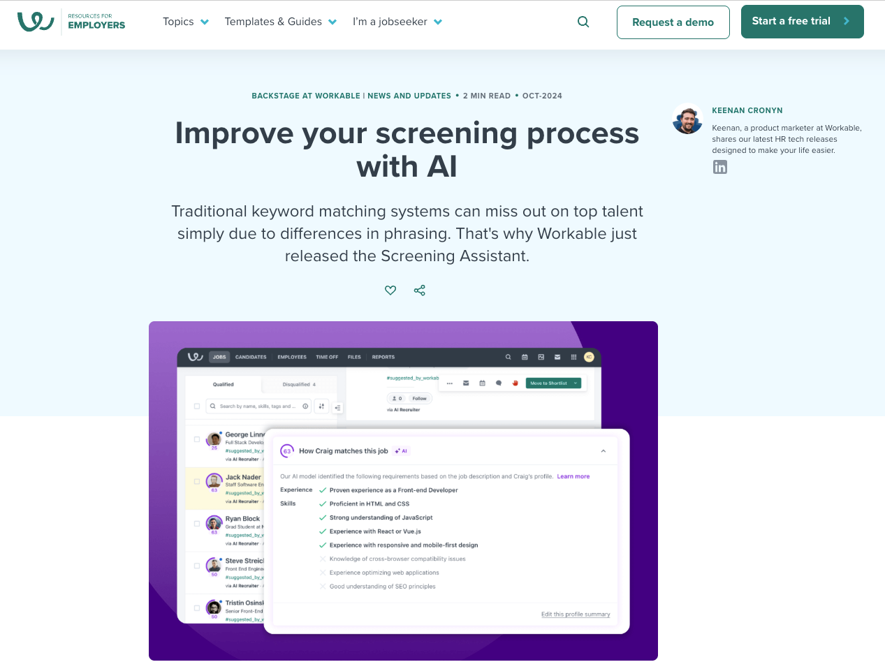 Workable's Screening Assistant uses semantic analysis to understand resume context and meaning rather than just matching keywords. The platform ranks candidates automatically and offers anonymized screening to reduce bias.