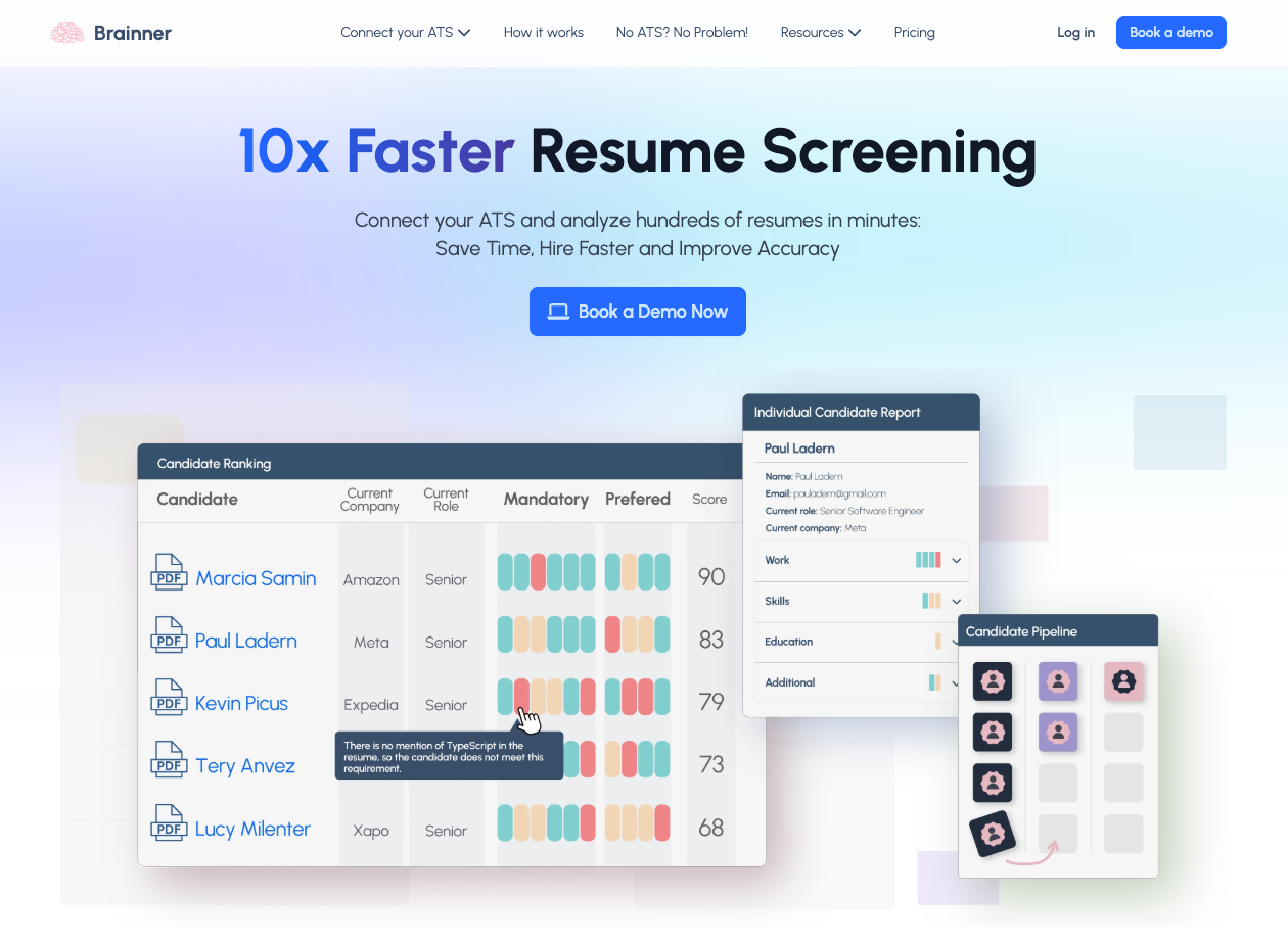 Brainner plugs directly into major ATS platforms (Lever, Ashby, Greenhouse, Workable) to provide real-time resume screening as candidates apply. The AI suggests criteria from job descriptions, which recruiters can customize before screening begins.