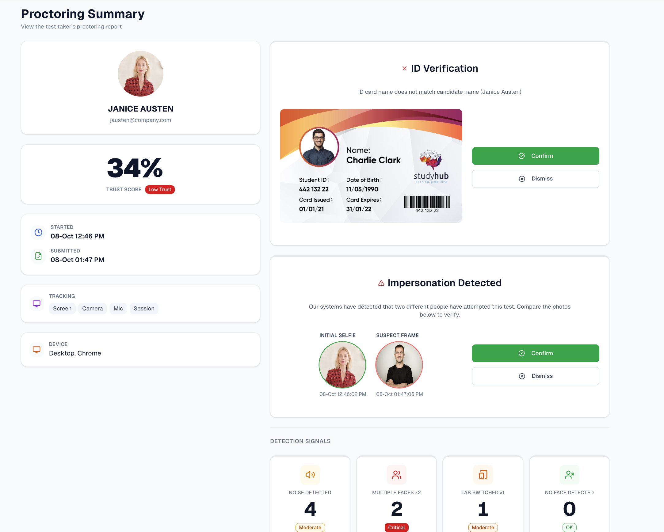 We randomly capture photos throughout the assessment at unpredictable intervals and compare every shot to the original verification photo. If a different face appears, you get an alert with the evidence.