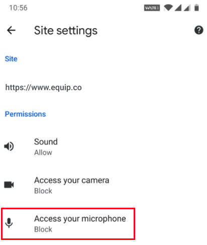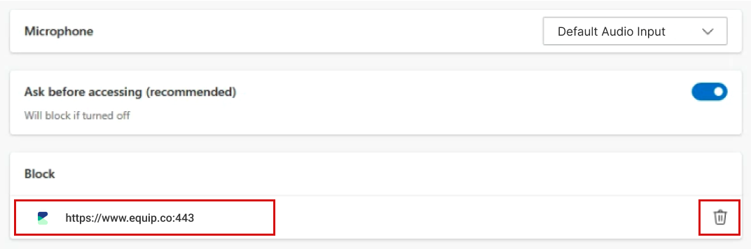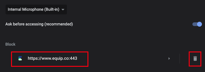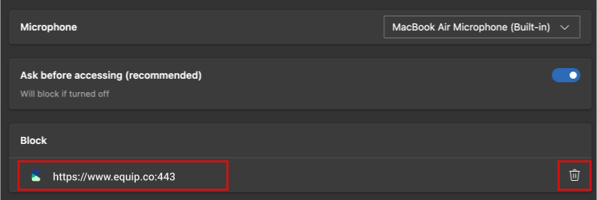 Firstly, the Microphone option should be enabled. That is, it must look like the blue "pill" you see below. If you see the Equip site under Blocked, click on it, Else, move to Point 8.