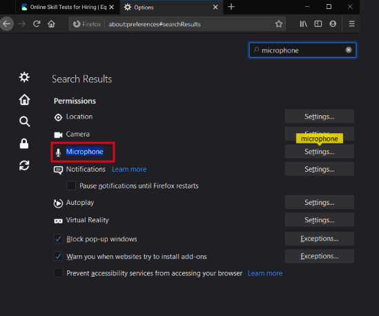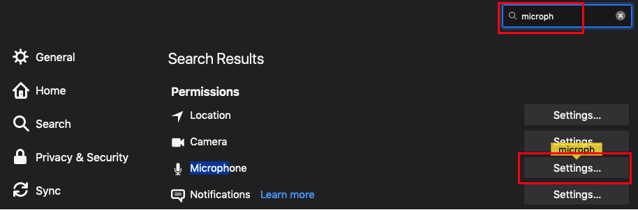 Click on Firefox at the top left of your screen and then click on Preferences.In the tab that opens up, type microphone at the top right. Then, click on Settings next to Microphone.