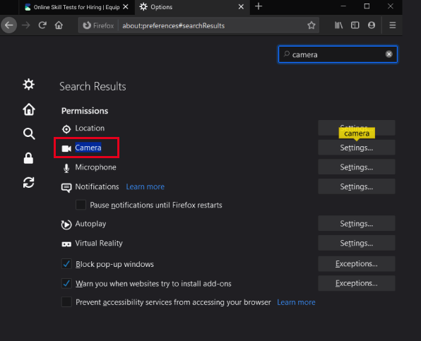 In the tab that opens up, type camera at the top left search. You should see "1 result" under All permissions. Click on camera.