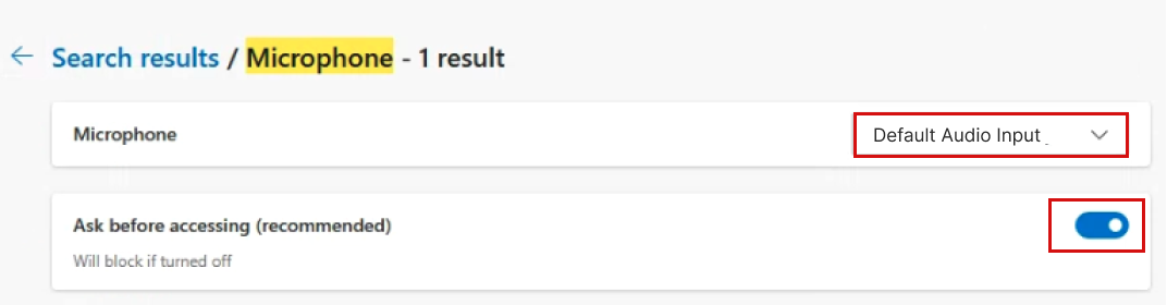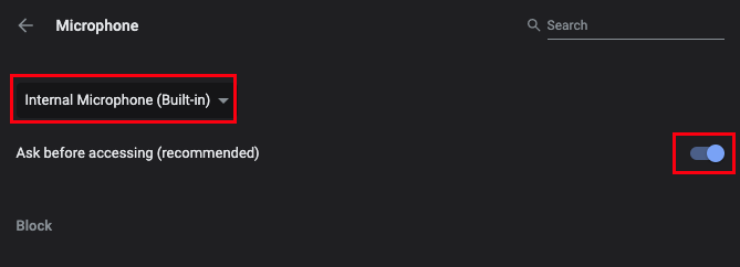 Ensure that Internal Microphone is selected in the drop-down. If the toggle switch at the right is off, click on it so that the text changes from Blocked to "Ask before.."