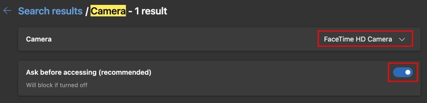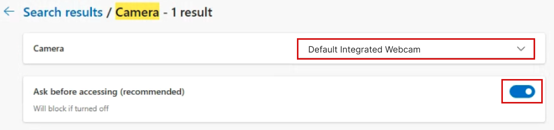 Ensure that Internal Built-in Camera is selected in the drop-down. If the toggle switch at the right is off, click on it so that the text changes from Blocked to "Ask before.."