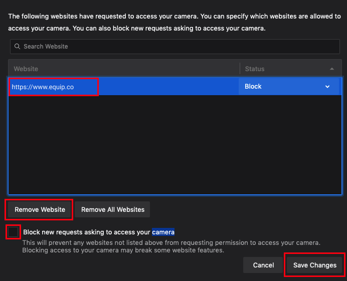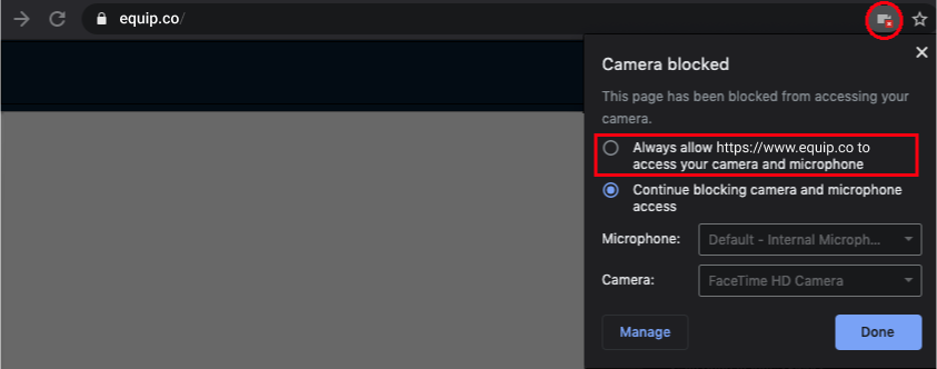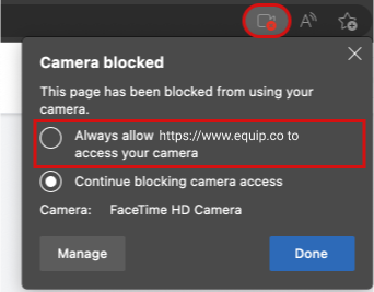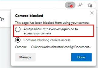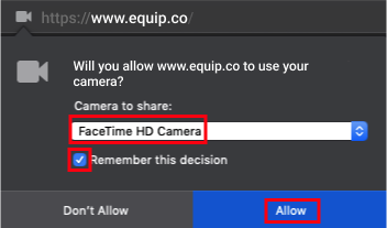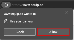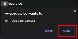 Click the Check Camera button below and then click on Allow when “www.equip.co” prompts you for your camera permission.