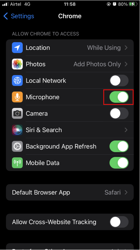Goto Home → Settings → Chrome, Tap the toggle button next to Microphone to turn it on.