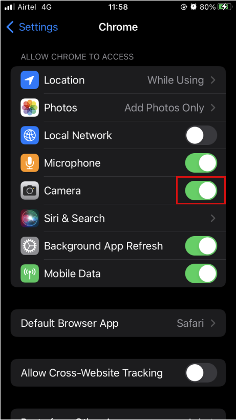 Goto Home → Settings → Chrome, Tap the toggle button next to Camera to turn it on.