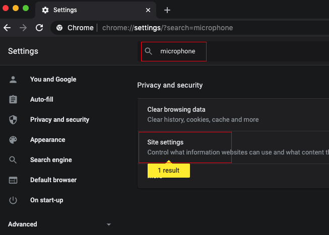 In the tab that opens up, type microphone at the top. You should see "1 result" under Site Settings. Click on Site Settings.