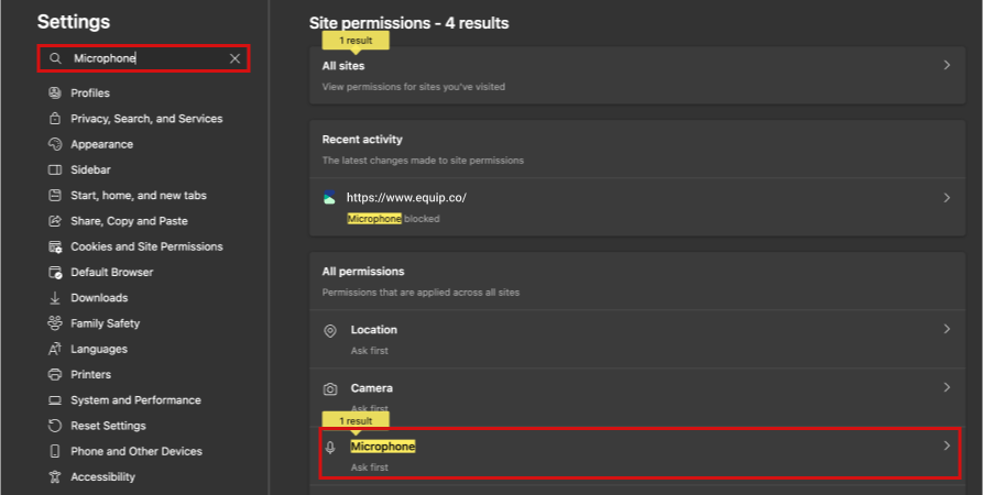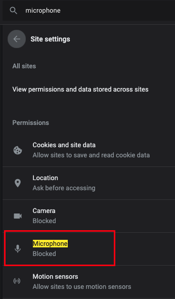 In the tab that opens up, type microphone at the top left search. You should see "1 result" under All permissions. Click on Microphone.