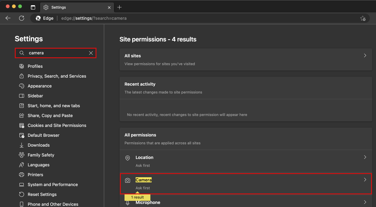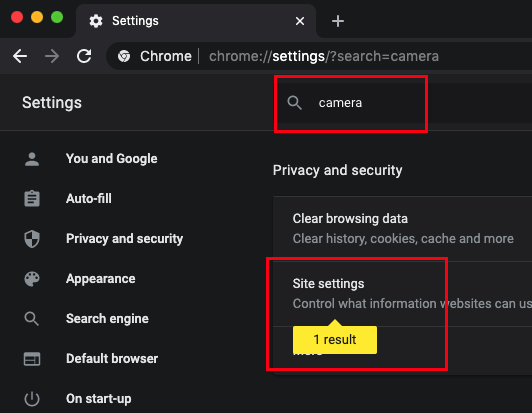 In the tab that opens up, type camera at the top. You should see "1 result" under Site Settings. Click on Site Settings.