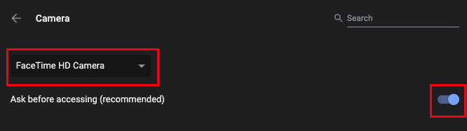 Ensure that FaceTime HD Camera or Internal Built-in Camera is selected in the drop-down. If the toggle switch at the right is off, click on it so that the text changes from Blocked to "Ask before.."