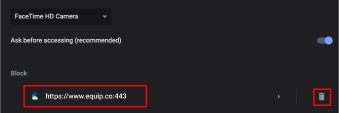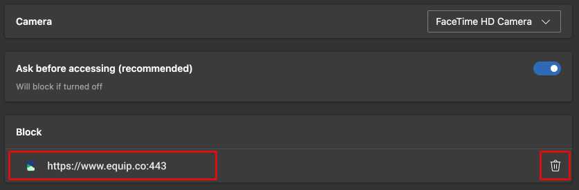 Firstly, the Camera option should be enabled. That is, it must look like the blue "pill" you see below. If you see the Equip site under Blocked, click on it, Else, move to Point 8.