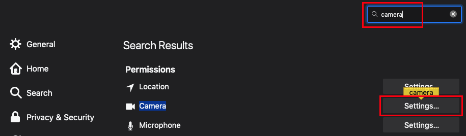 In the tab that opens up, type camera at the top right. Then, click on Settings next to Camera.