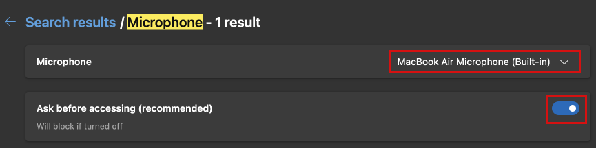 Ensure that MacBook Air Microphone (Built-in) or Internal Microphone is selected in the drop-down. If the toggle switch at the right is off, click on it so that the text changes from Blocked to "Ask before.."